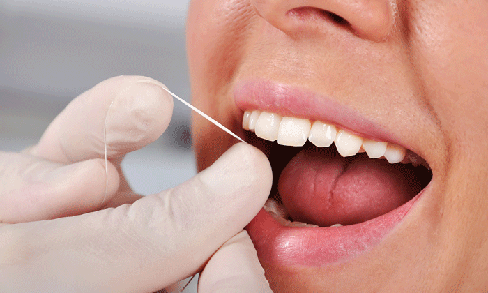 Die Zahnzwischenräume kann man mit Interdentalbürstchenoder, wie hier, mit Zahnseide reinigen. Foto: fotolia / vetkit