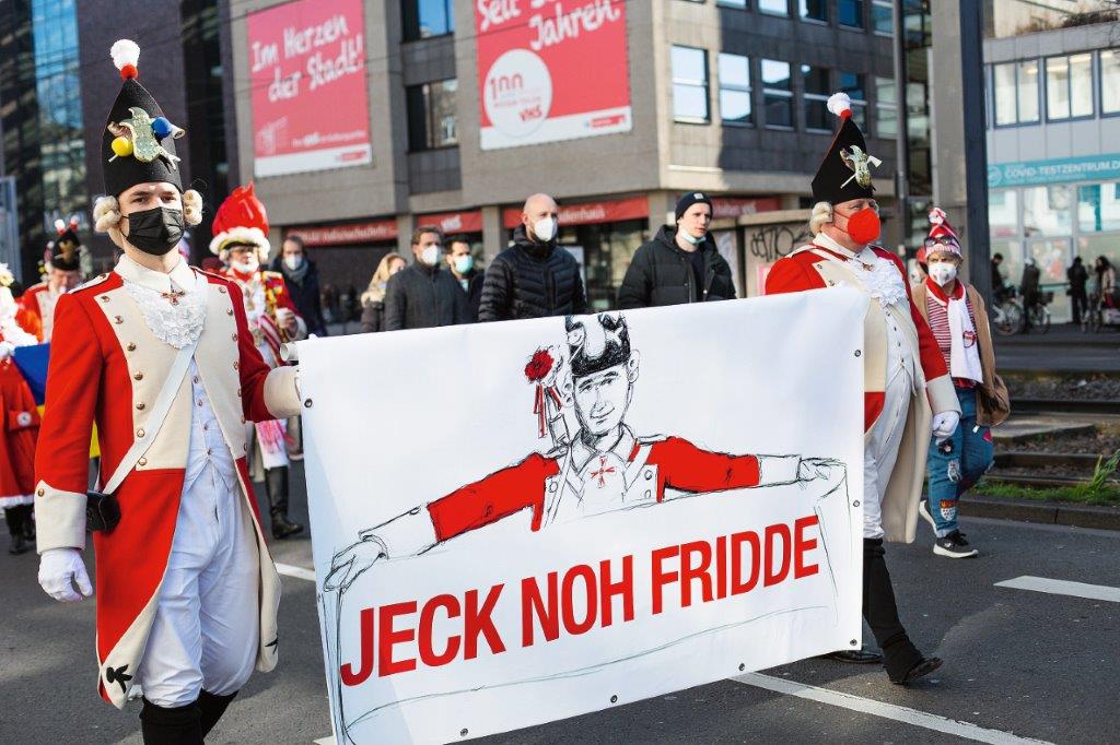 Mehrmals in 200 Jahren fiel der Zug aus – wegen Wetter, Wirtschaftskrise, Krieg. So auch 2022. Gegen den Ukraine-Krieg demonstrierend zogen die Roten Funken und andere Jecken trotzdem durch Kölns Straßen. Foto: Nina Gschlößl
