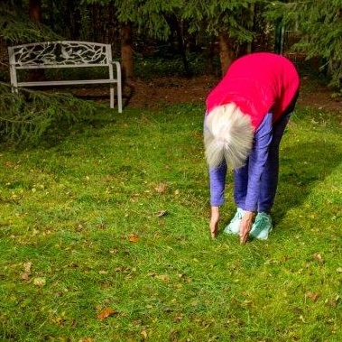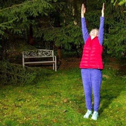 Strecken Sie Ihre Arme weit dem Himmel entgegen nach oben, Ihr Blick folgt den Händen. Dann den Ober- körper langsam, Wirbel für Wirbel, nach unten zu Ihren Füßen sinken lassen. Die Finger können den Boden berühren. Dann wieder vorsichtig und langsam, Wirbel für Wirbel, aufrichten. Empfehlung: 3–5 Wiederholungen