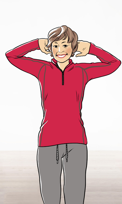 Stehend oder sitzend nehmen Sie bei gesenkter Schulter Ihre Hände an den Hinterkopf und ziehen Ihre Ellenbogen weit nach vorne und wieder nach außen zurück.