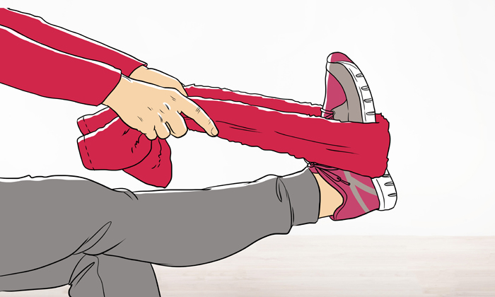 Setzen Sie sich auf einen Stuhl und rollen Sie ein großes Handtuch der Länge nach ein. Dann strecken Sie ein Bein, umfassen den Fuß mit dem Handtuch und ziehen ihn mit den Enden des Handtuchs zum Körper hin. Danach versuchen Sie Ihre Fußspitze trotz sanftem Gegendruck durch das Tuch nach vorne zu schieben.