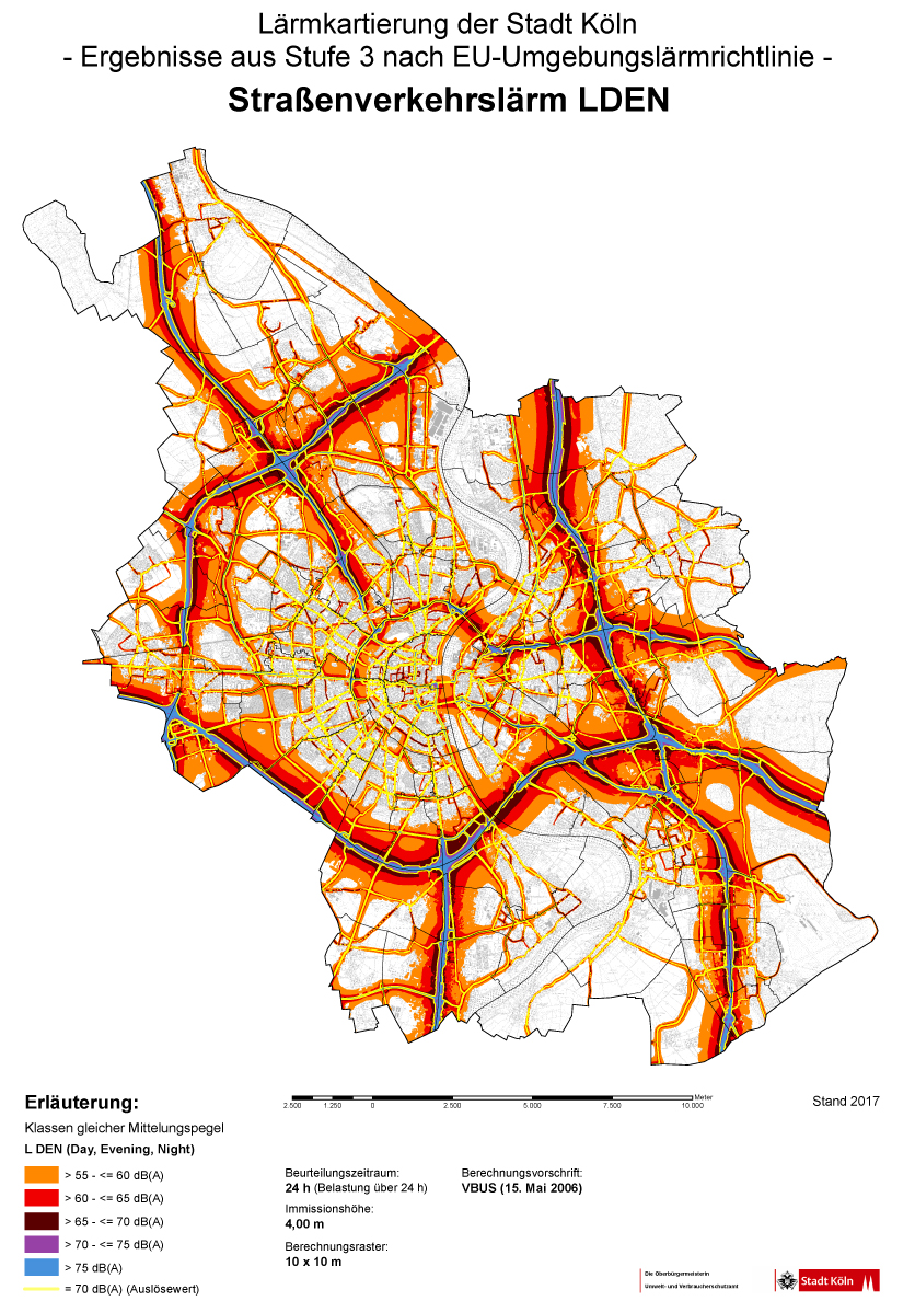 Der Lärmaktionsplan hat die „Hotspots“ der Stadt ermittelt, also die Stellen, an denen es besonders laut ist und wo der Lärm besonders viele Menschen betrifft. Zu diesen Belastungsschwerpunkten gehören etwa Abschnitte der Ringstraße, die Kalker Hauptstraße und die Neusser Straße. Ein Blick auf die Lärmkarten Kölns zeigt allerdings viele lila und rot eingefärbte Straßenzüge. Das bedeutet: Dort beträgt die Lärmbelastung mehr als 70, teilweise sogar mehr als 75 Dezibel. Der Europäischen Union zufolge soll es aber in Städten tagsüber nicht lauter als 55 Dezibel sein, das entspricht etwa einem Radiogerät in Zimmerlautstärke. Für die Nacht gilt ein langfristiger Ziel-Pegel von 50 Dezibel.
