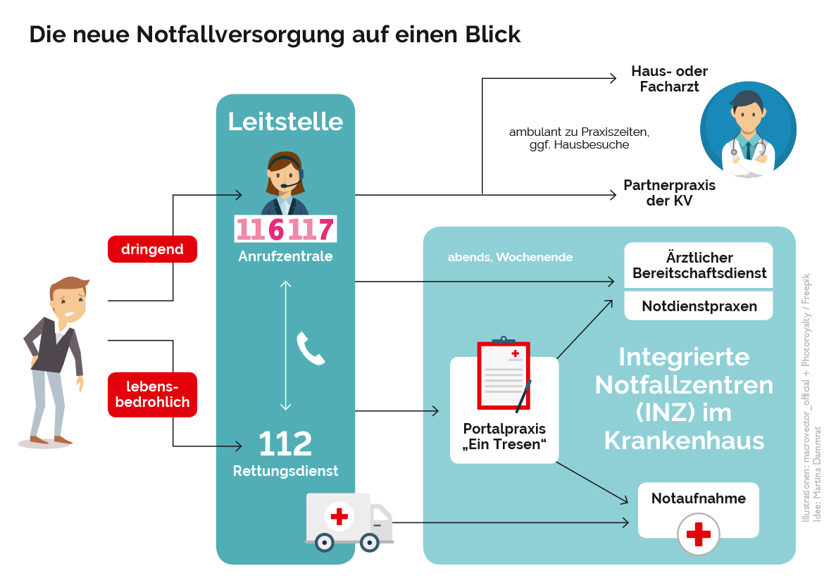 Notfallversorgung im Überblick. (Illustrationen: macrovector_official + Photoroyalty / Freepik, Idee: Martina Dammrat)