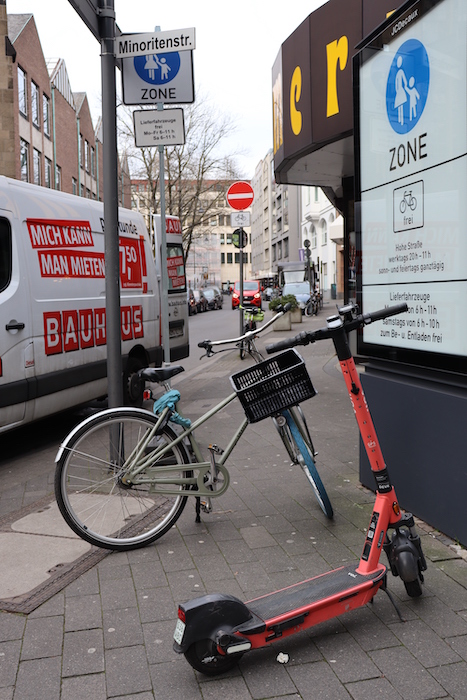 Sogar in ausgewiesenen Fußgängerzonen versperren Fahrräder und E-Roller den Weg. Foto: Lydia Schneider-Benjamin.