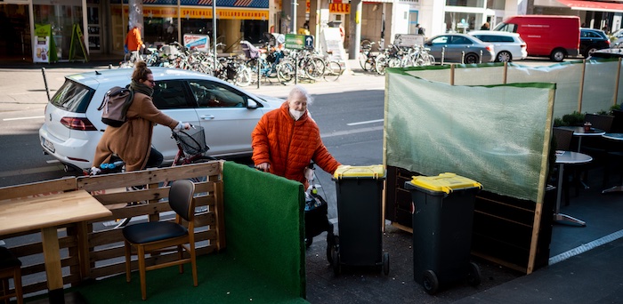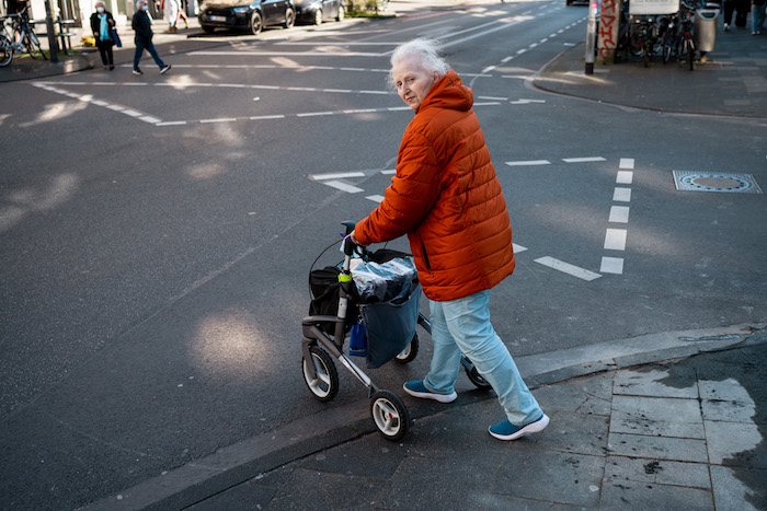 Zwischen Mülltonnen und Außengastronomie: Therese Urfey bewältigt mit Mühe den Parcours mit ihrem Rollator. Foto: Costa Belibasakis.