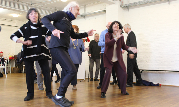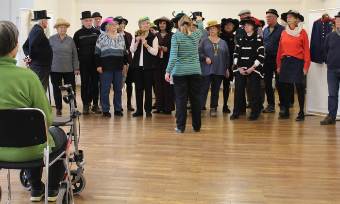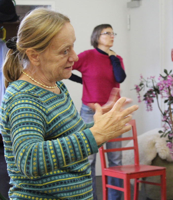 Taktgenau setzt das Akkordeon ein und alle singen das alte Volkslied: „Heut kommt der Hans zu mir....“ Jetzt unterbricht Akkordeonspielerin Sabine Falter genau an einer schwierigen Stelle des Textes. Sie ist Sängerin und Musikerin, zuständig für die Stimmarbeit, Musikdramaturgie und -improvisation. Sie weiß, dass es hilft Texte emotional zu verstehen, um die Betonung gezielter einzusetzen. Es sei wichtig, das Theatralische mit dem Stimmlichen zu verbinden. Immer wieder lobt und motiviert sie zwischendurch: „Es ist phänomenal, aus welch riesigem Erfahrungsschatz dieses Ensemble schöpfen kann.“
