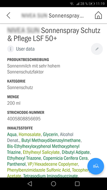 Sobald der Strichcode von der App registriert wurde, wird die Kamera deaktiviert. Automatisch erscheint das Produktbild mit einer kurzen Produktbeschreibung auf  Ihrem Display. Hier wurde beispielsweise ein Sonnenschutzspray getestet. Screenshot (Bildschirmfoto)