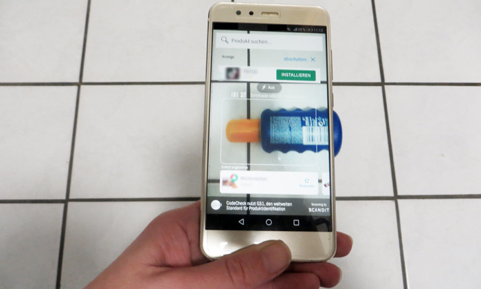 Nun wird Ihre Kamera automatisch aktiviert und es erscheint ein schmaler weißer Rahmen. Jetzt drehen Sie das Produkt so, dass der Strichcode (Barcode) genau in diesem Sichtfenster erscheint. Achten Sie auf eine ausreichend gute Beleuchtung, ohne dass die Oberfläche das Licht reflektiert.