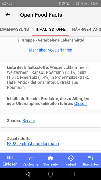 - Wenn Sie auf "Verlauf", das vierte Symbol im blauen Feld tippen, können Sie jedes Ihrer eingescannten Produkte im Detail untersuchen und miteinander vergleichen.