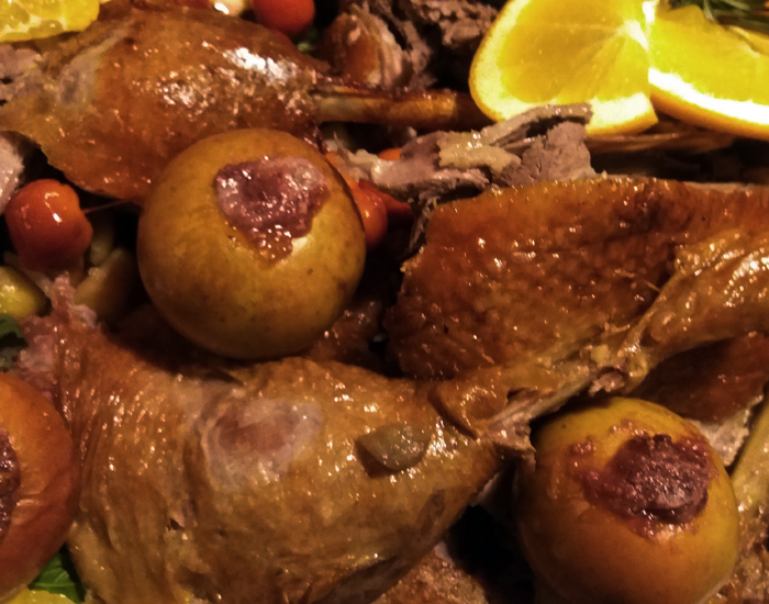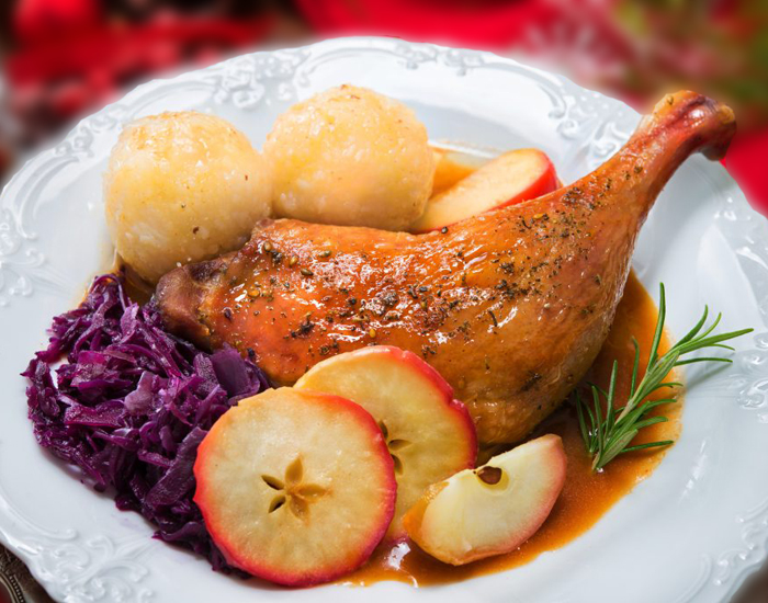 Die Gans wird in tellergerechten Stücken auf einer silbernen Platte aufgetragen, garniert mit Bratäpfeln, Maronen und exotischen Früchten. Kartoffelklöße, Rot- und Rosenkohl sowie eine deftige Soße aus Maronen, Zwiebeln und Äpfeln machen die gedeckte Tafel zum wahren Augenschmaus. Das Fleisch ist zart, saftig und wohlschmeckend sowie gut auf den Punkt gegart. Etwas mehr Oberhitze zum Schluss hätte die goldbraune Haut knuspriger werden lassen.